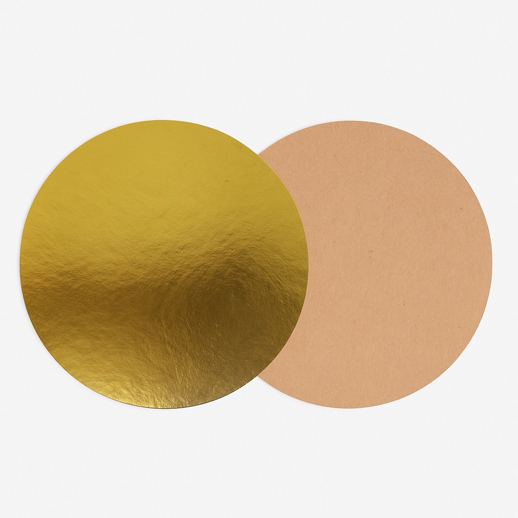 Подложки круглые и сольерки для порционной подачи выполнены с односторонней ламинацией в цвете-золото, толщина- 0,8 мм